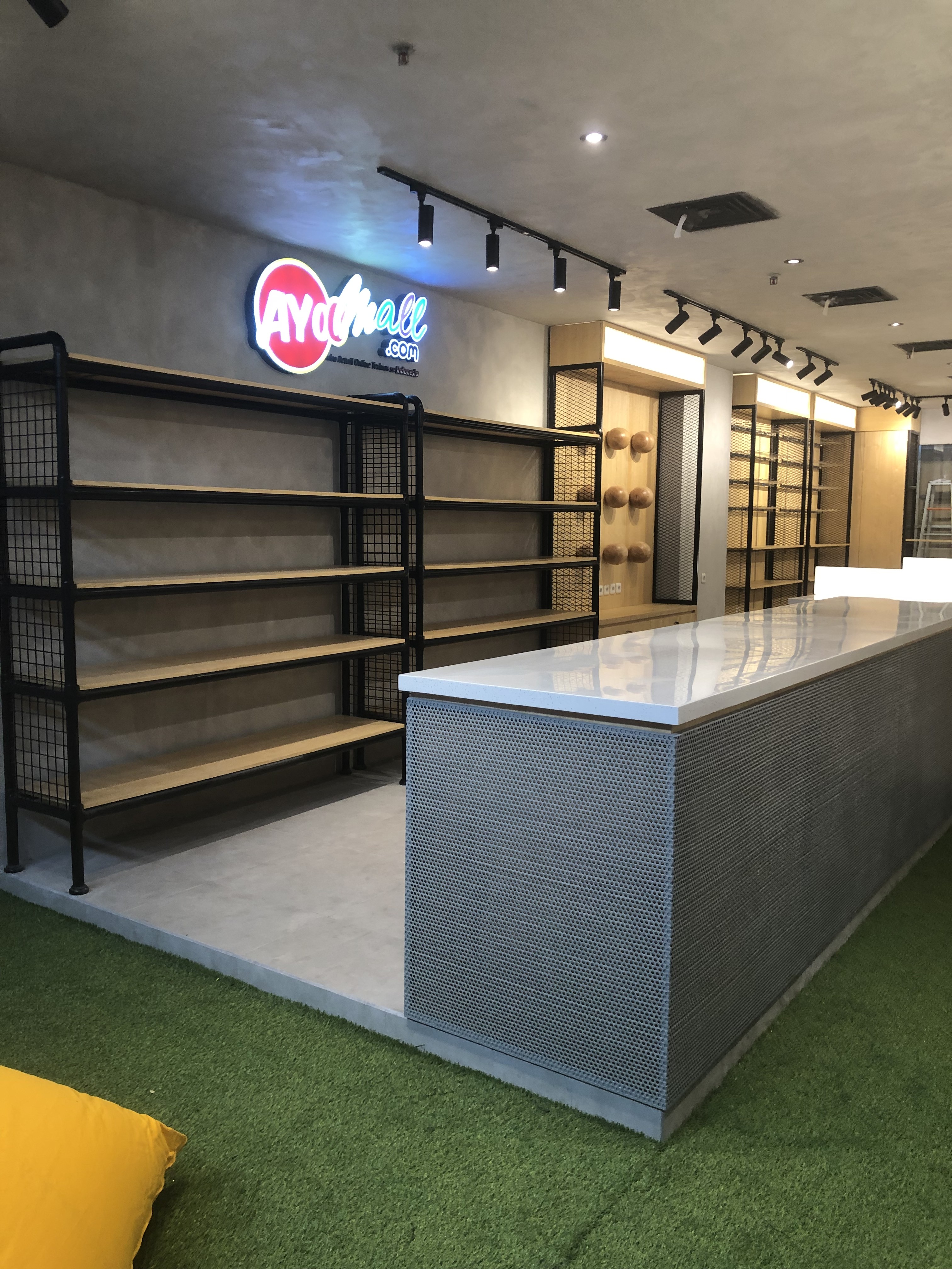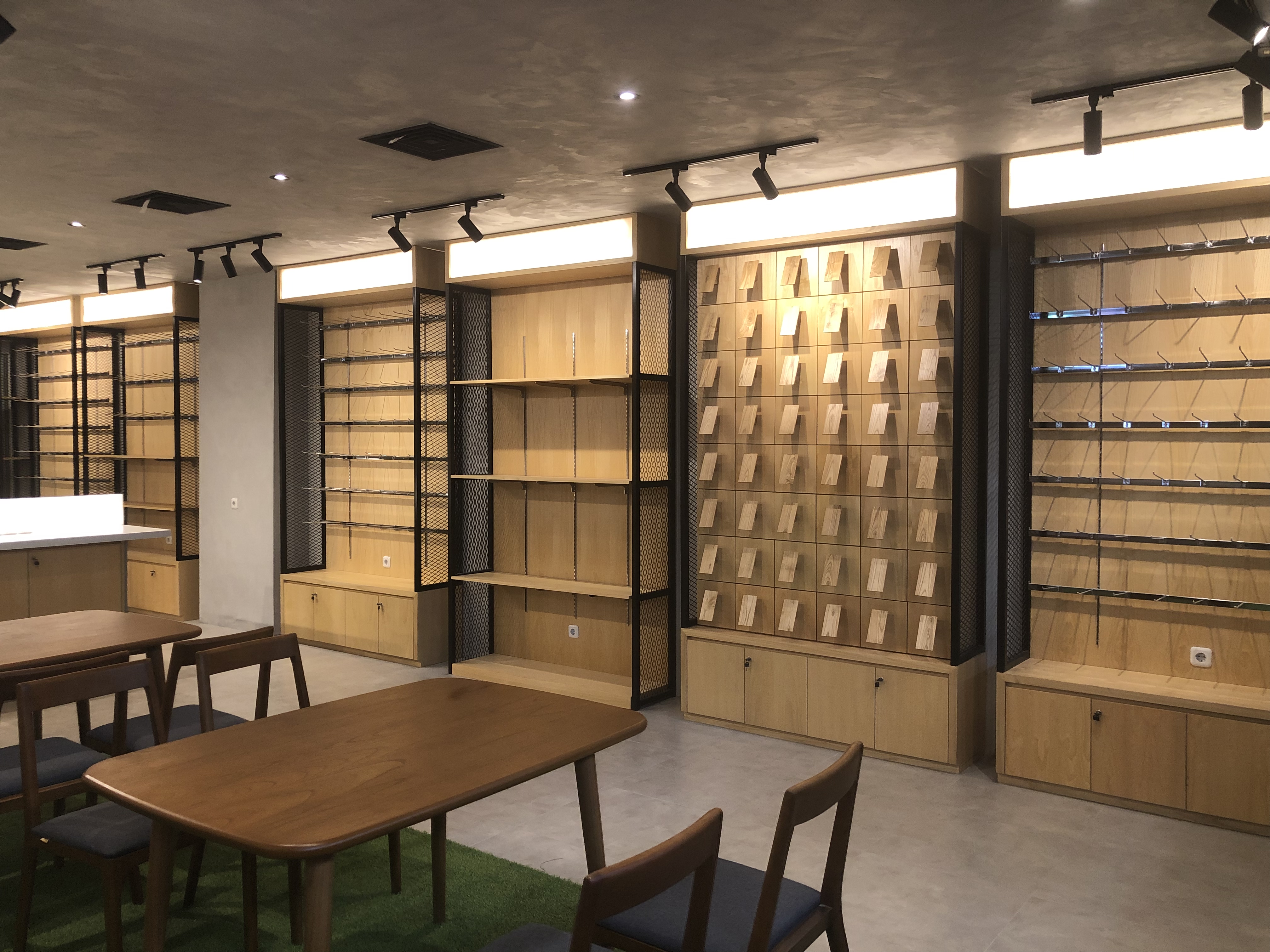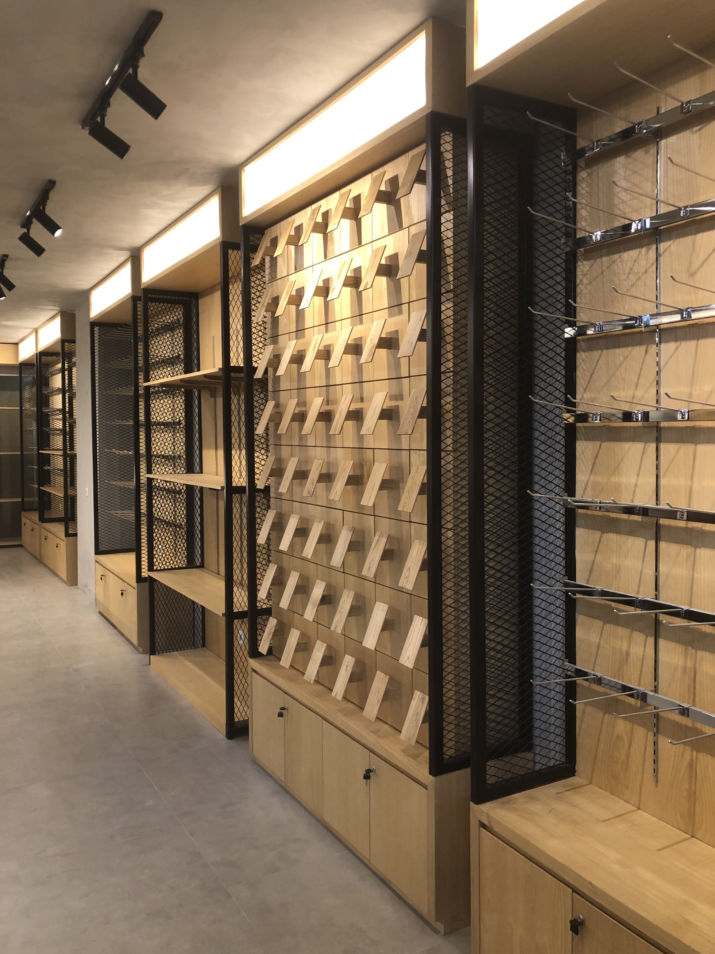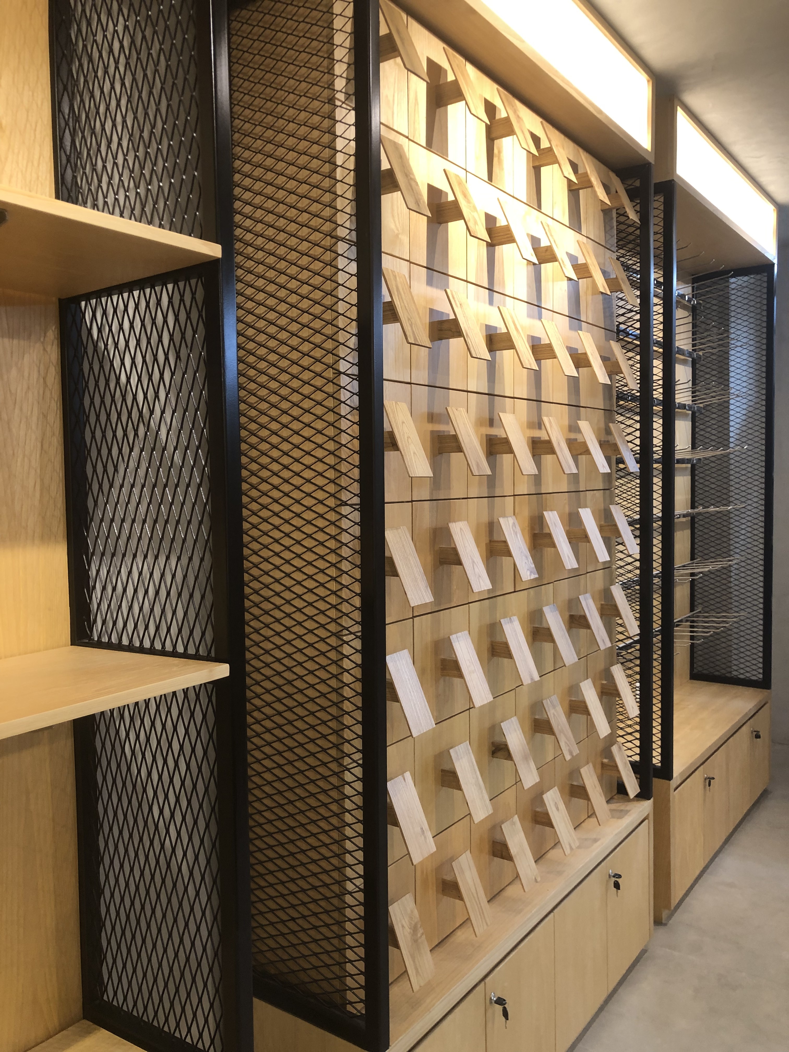 Fresh Raw Materials with Natural finishes in the contrasting textures. Stacking up storage with customize display product items made from Iron bending, perforated steel panel, exposed concrete layered with natural wooden look. Creating roughly sense texture but with sleek finishing touches.