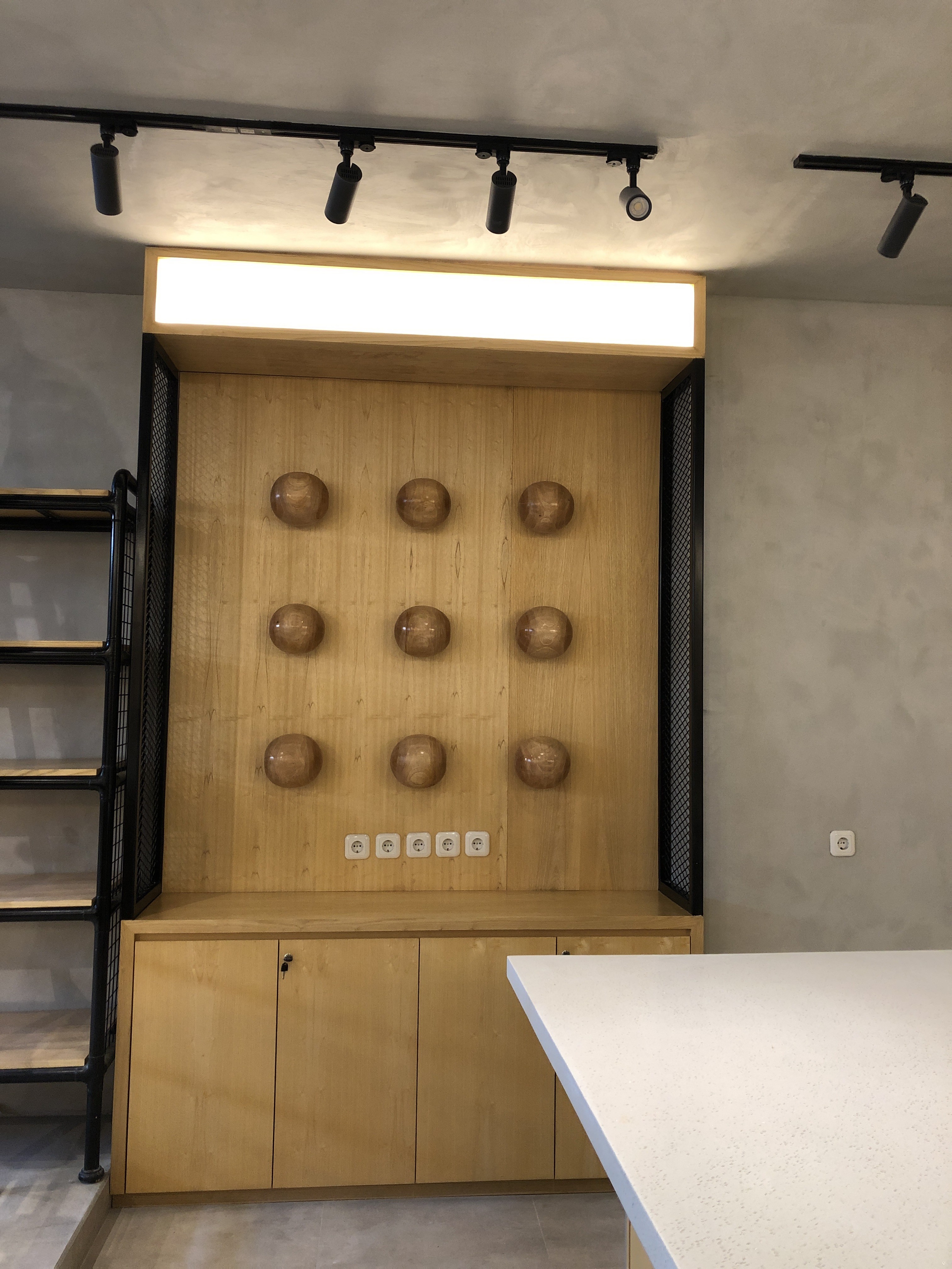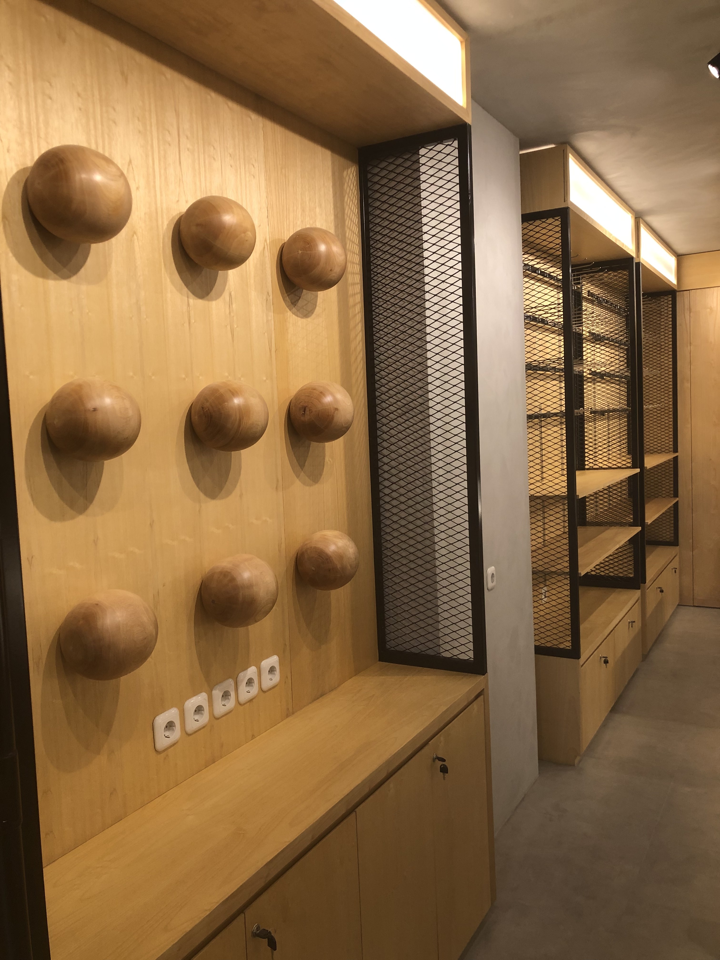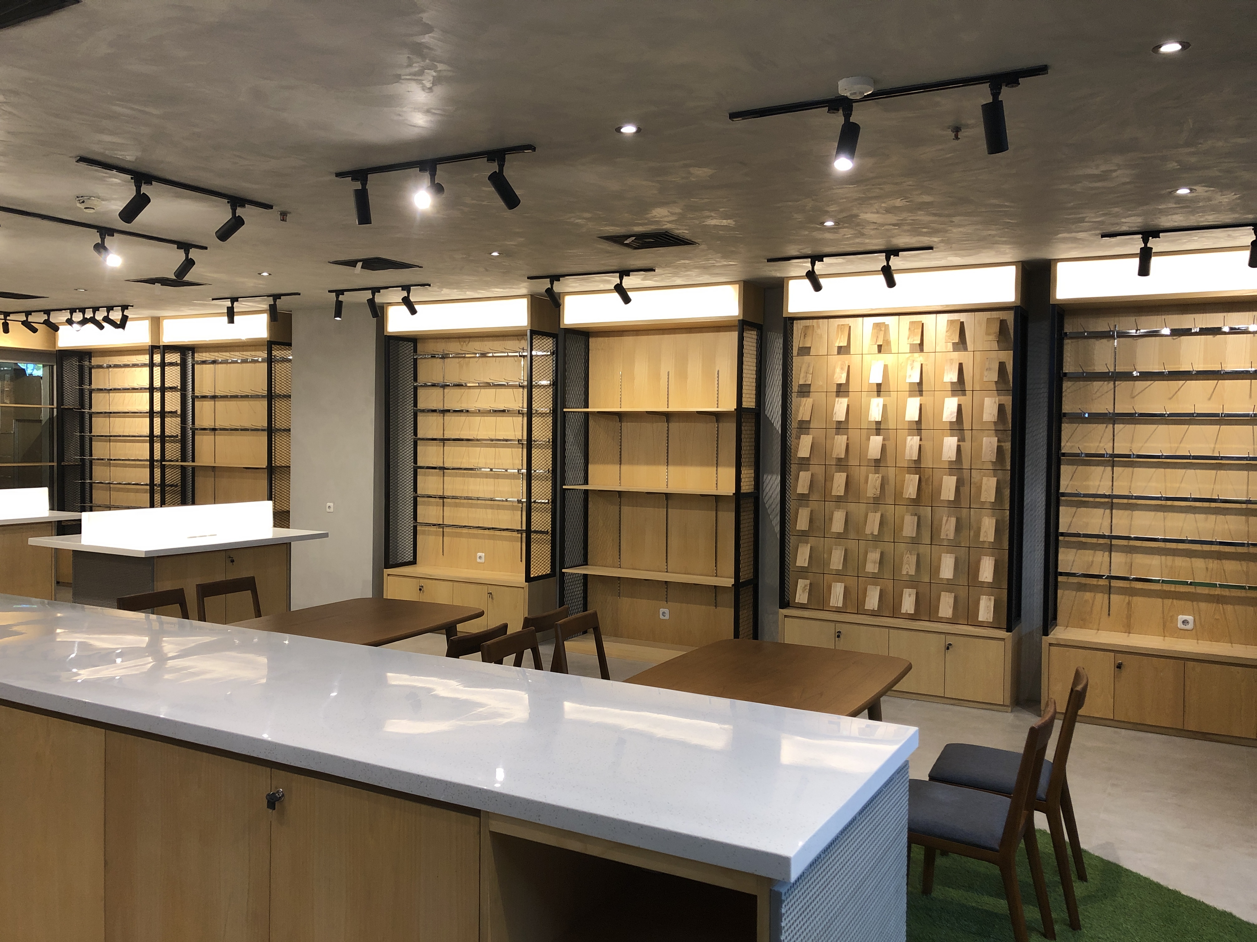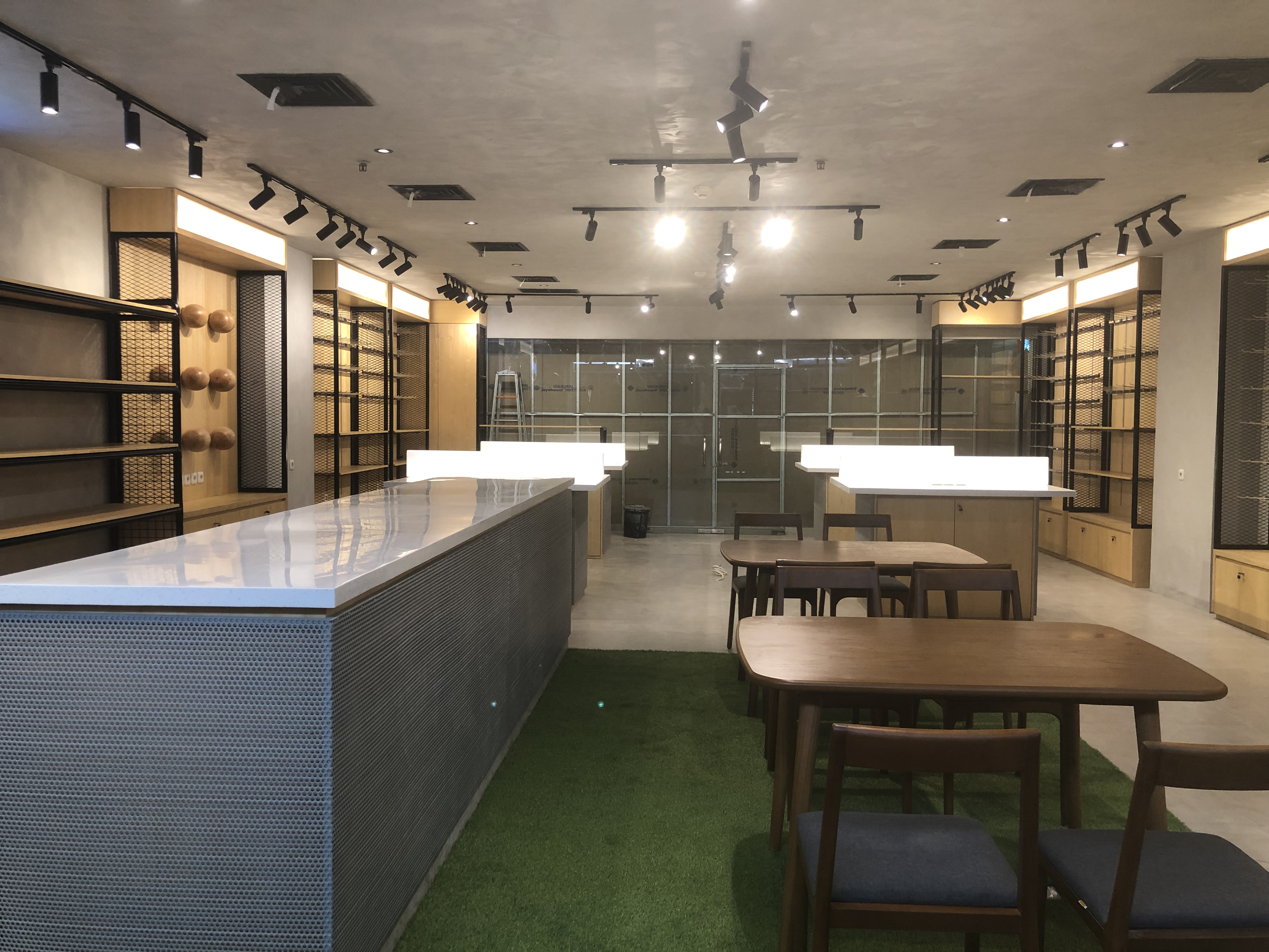Fresh Raw Materials with Natural finishes in the contrasting textures. Stacking up storage with customize display product items made from Iron bending, perforated steel panel, exposed concrete layered with natural wooden look. Creating roughly sense texture but with sleek finishing touches.