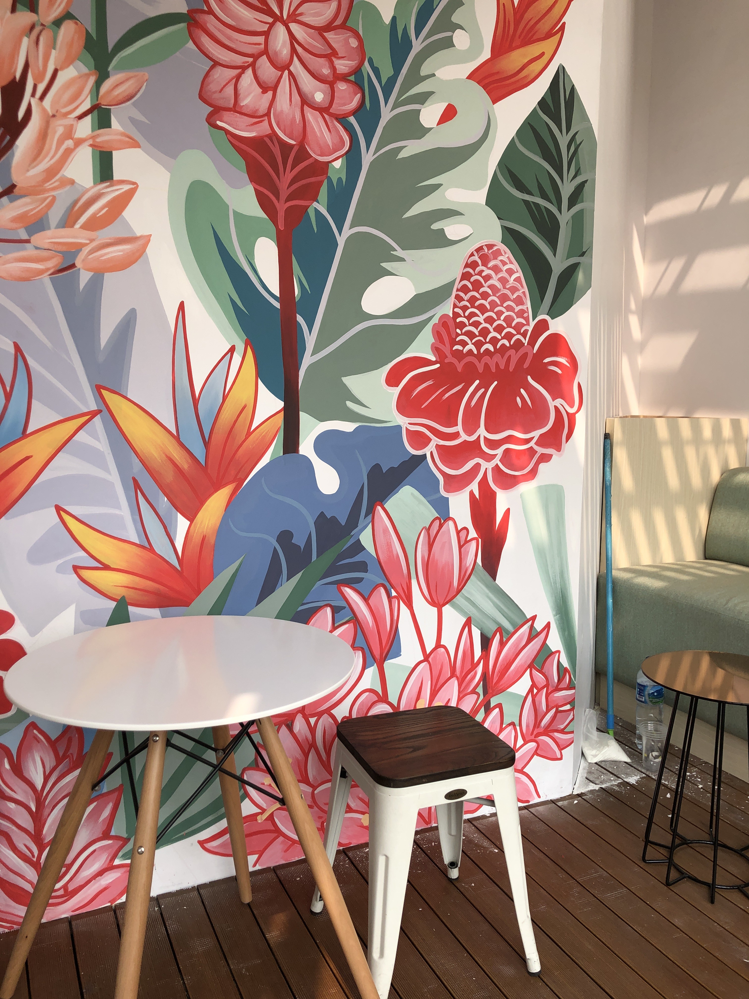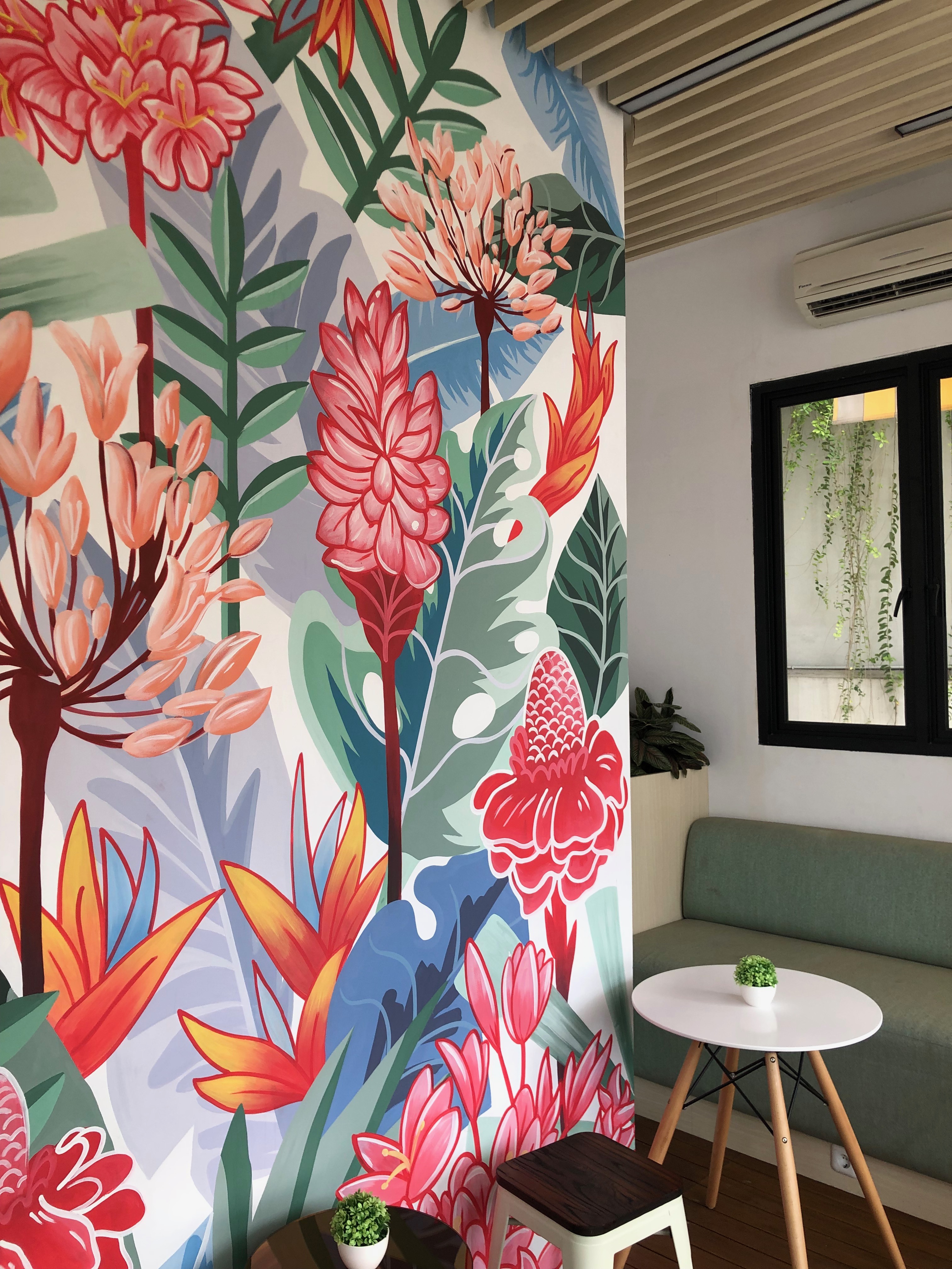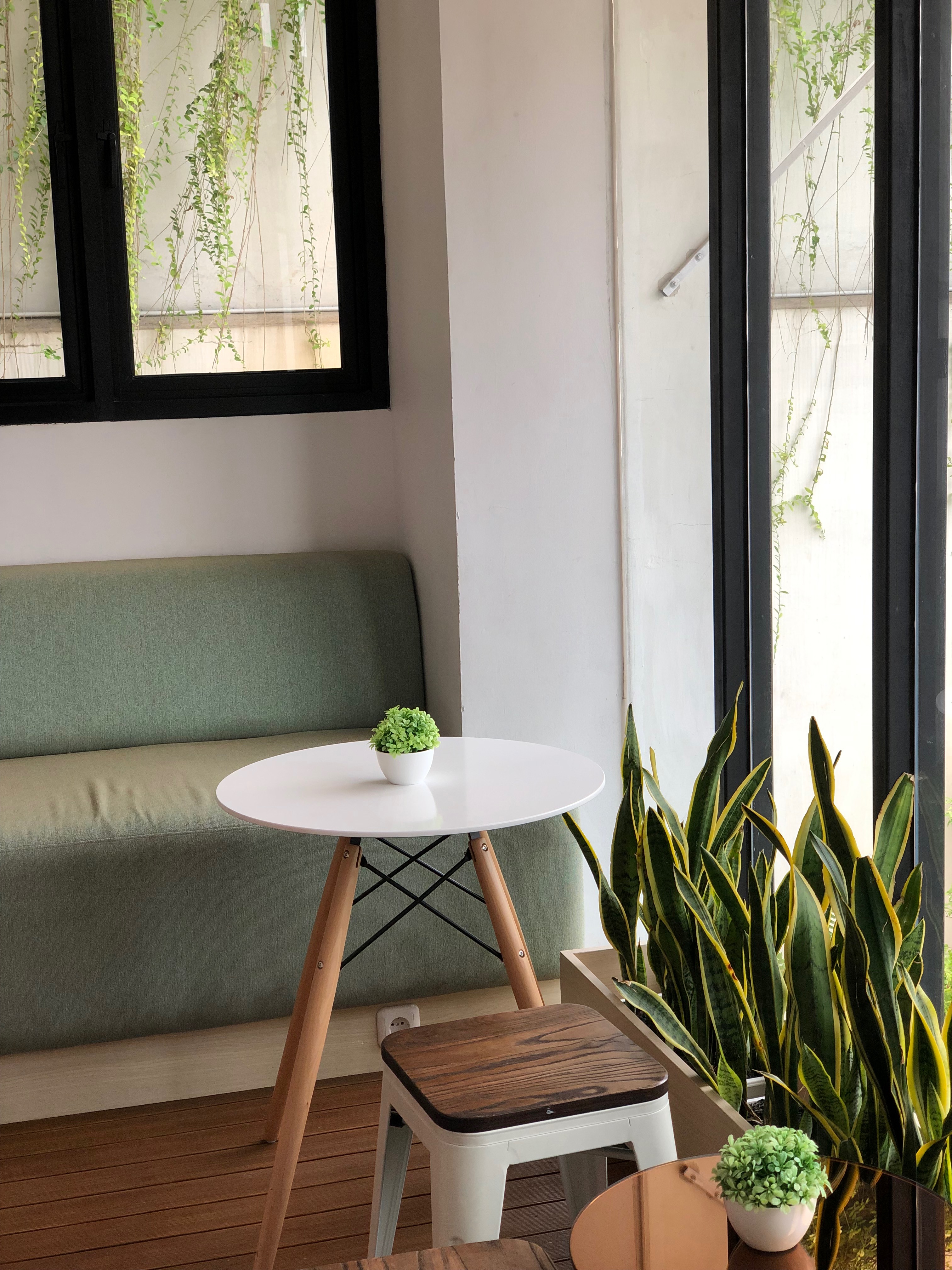 Fresh corner space were planned and changed to a small cafe for an extra retail business. Covering the existing structures with a new finishes and layered it up for an extra space create an intimate gathering spaces. Small hidden gem in the area inside a well-known beauty clinic in Tebet area. .