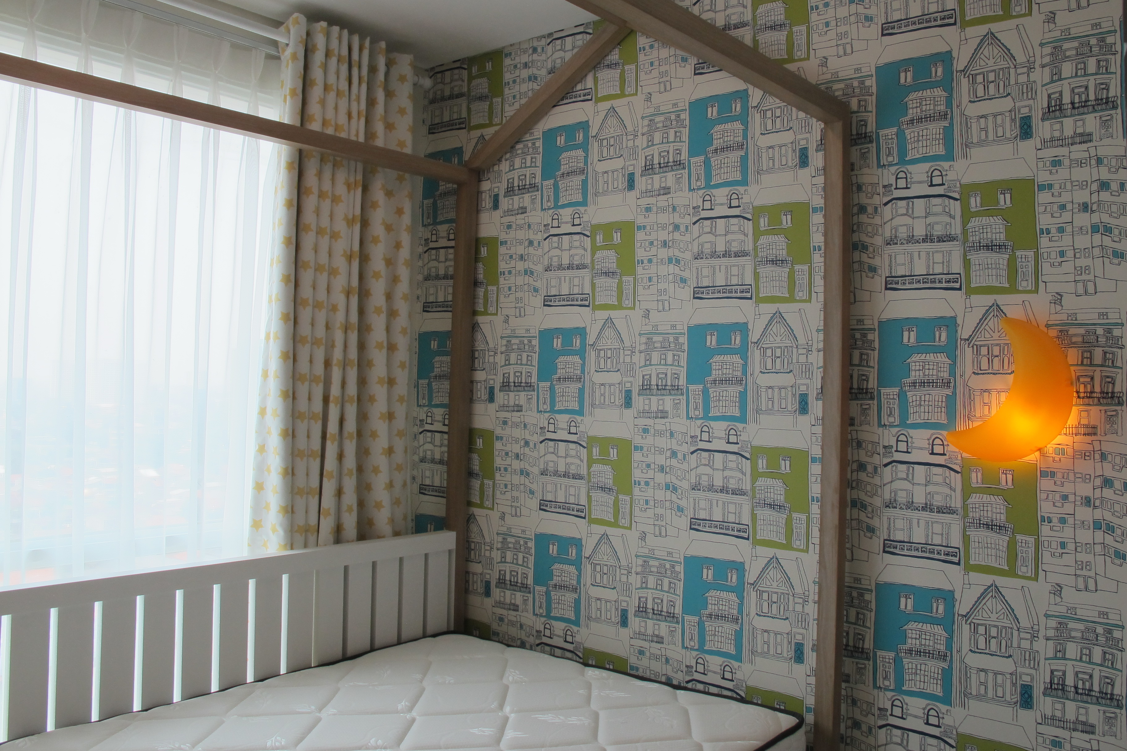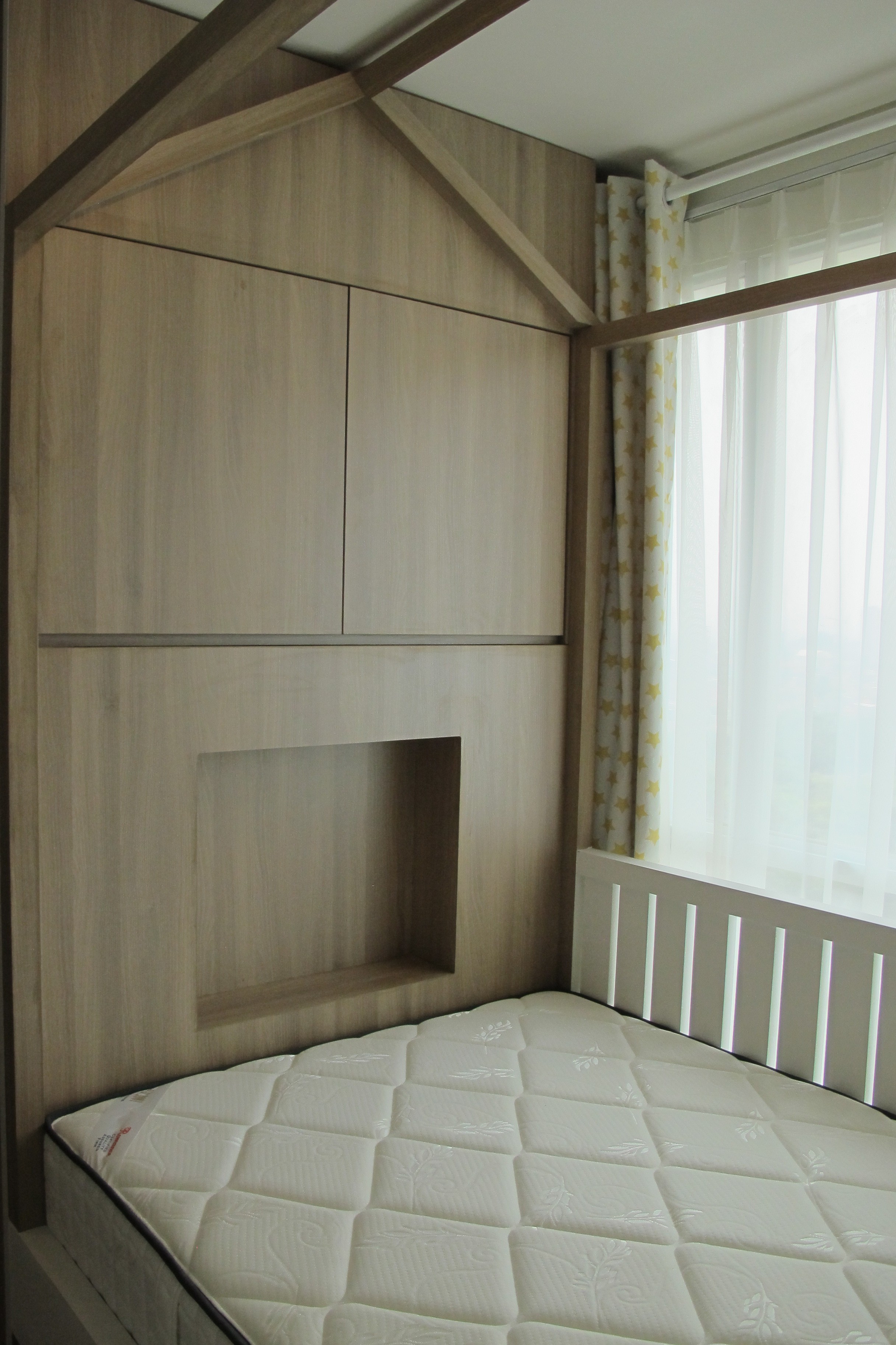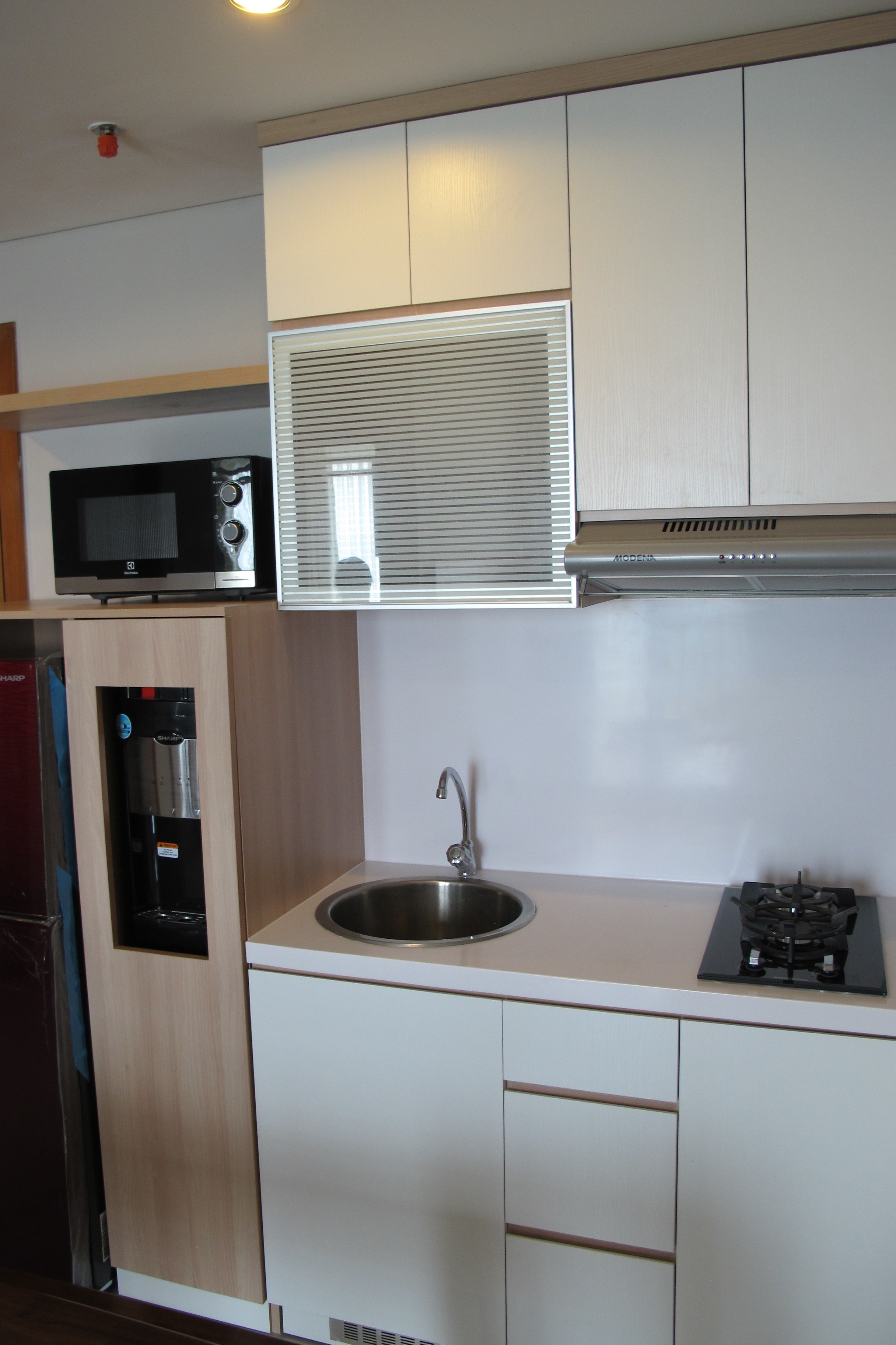 Light wood colors to bring out the extra brightness at the apartment to combine with modular compact storage to maximize the storage spaces. Simple shape yet functional, clean look and one line visuality.
